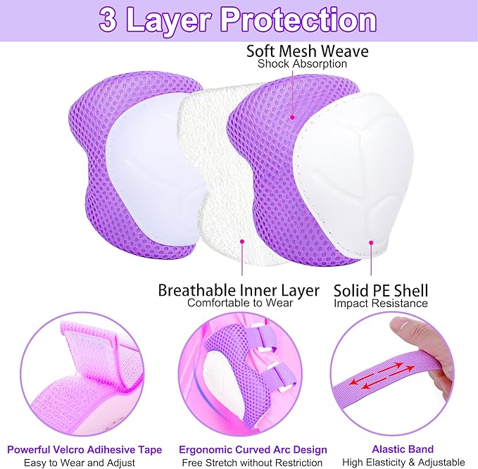 - 【Knee Pads and Elbow Pads Set for Kids】 The kids bike helmet comes with 2 x Elbow Pads, 2 x Knee Pads, and 2 x Wrist Pads. Consist of an anti-scratch extra hard PVC shell for protection, and velcro adjustable straps ensure the protective gear will not shift. Protective gear pad set provides comprehensive safety protection for children.