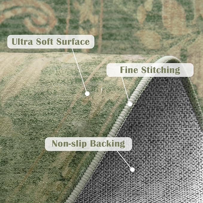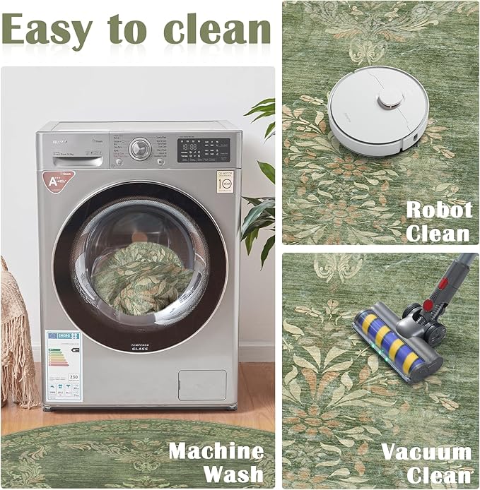 jinchan Round Rug 7ft Area Rugs,Vintage Floral Distressed Design Machine Washable Soft Non-Slip Low-Pile Ultra-Thin Circle Rug for Living Room Dining Room Bedroom Home Office (7' Round,Dark Green)