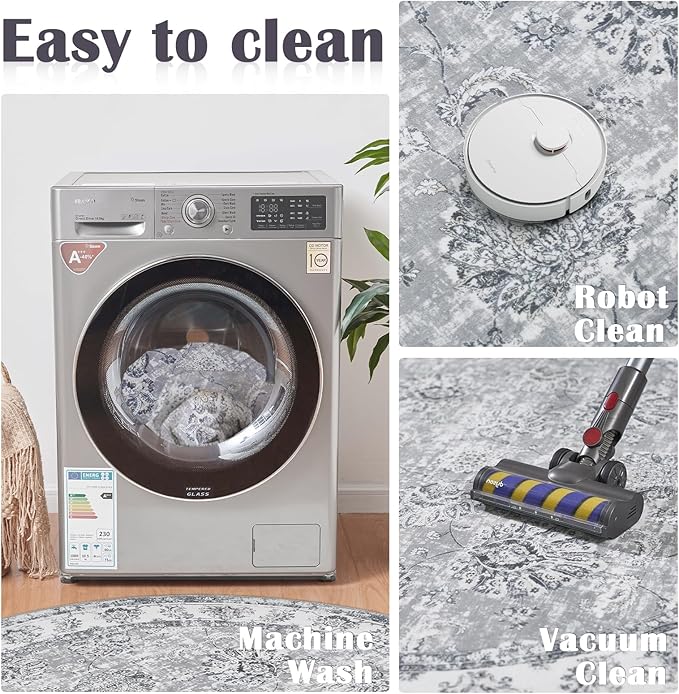 jinchan Round Rug 6ft Area Rug - Grey Vintage Floor Mat Kitchen Indoor Ultra-Thin Soft Floral Print - Washable Circle 6' Retro Accent for Farmhouse Non Slip Dining Room Living Room Bedroom Office
