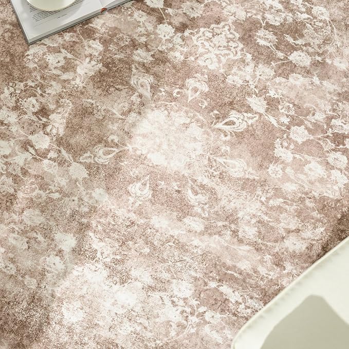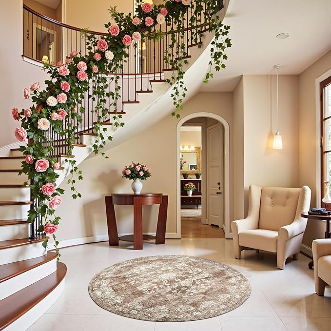 jinchan Round Rug 4ft Area Rug - Brown Vintage Floor Mat Kitchen Indoor - Washable Circle 4' Thin Floral Print Carpet Retro Farmhouse Non Slip Dining Room Living Room Bedroom Office