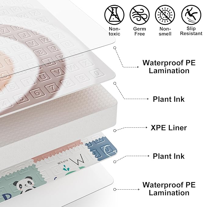 - Safe and Comfortable: Made of high-density, scratch resistant XPE foam material, BPA free and non-toxic, provides ample space for babies to crawl, walk and play. 0.4 inch thick mat provides cushioning protection, Protect infants from serious falls and floor collisions
