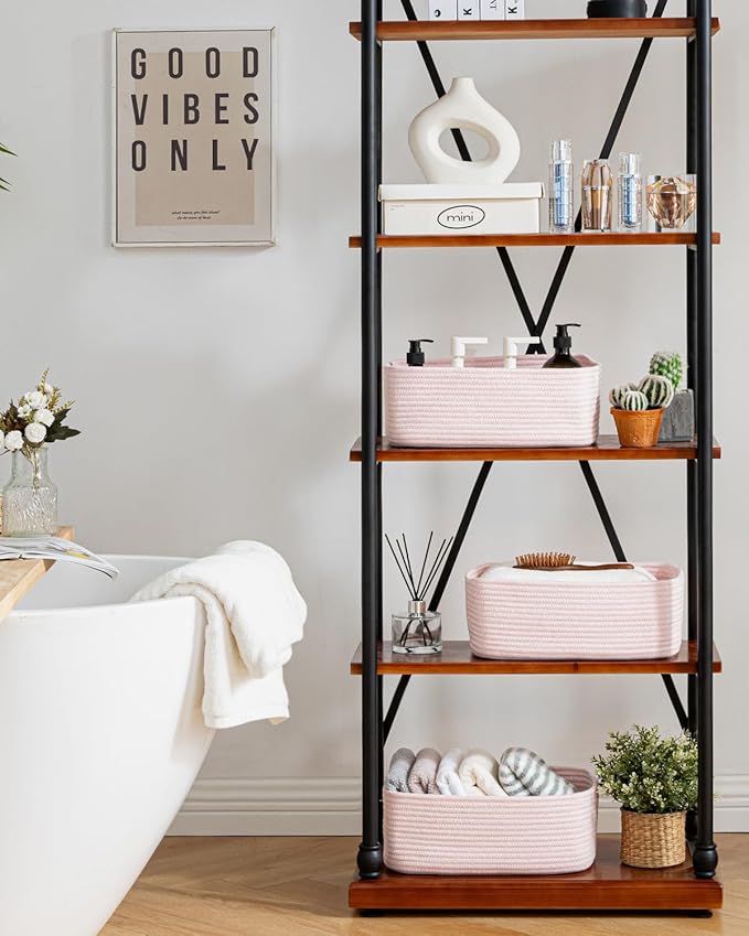 - [ Elegantly Designed to Match Any Décor ] Our small rope basket creates a minimalist appearance, and it adds a touch of warmth and texture to any room. The classic solid color design ensures seamless integration with your existing aesthetics, complementing any decoration. Perfect as decorative storage baskets for shelves, cabinets, and any open display space, making them a stylish and practical addition to any decor, enhancing the overall aesthetics of your room