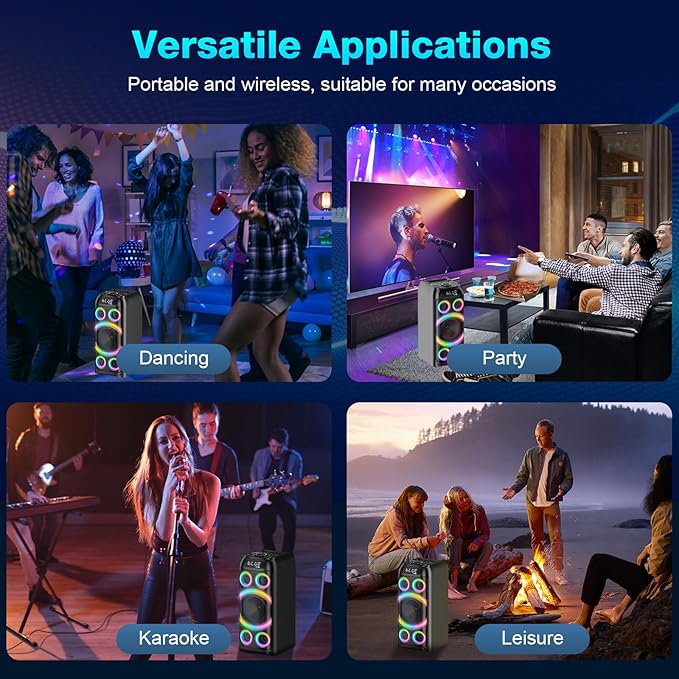 - ♫ EQ Mode and Multiple Playback Modes: T77 large partybox has 3 EQ modes -- Indoor, Outdoor and Bass modes , just short-press the 'EQ' button to switch to customize your favorite sound. Enjoy deep bass, clear mids, and crisp treble. T77 portale bluetooth speaker supports Bluetooth 5.0, TF card, 3.5mm AUX audio cable and USB flash drive to transfer your favorite music. T77 party speaker is ideal for birthday, Thanksgiving, New Year's Eve party, Christmas, gym and indoor and outdoor activities.