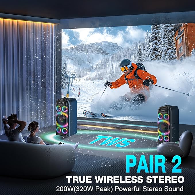 - ♫ True Wireless Stereo (TWS) Pairing and Bluetooth 5.0 : Easily pairing two T77 party bluetooth speakers wirelessly, creating a 320w extremely exciting stereo surround soundstage, T77 party bluetooth speakers are perfect for immersive cinemas, home parties, outdoor sports... With the bluetooth 5.0 technology, the connection of T77 wireless bluetooth speaker is faster, more stable and easier.