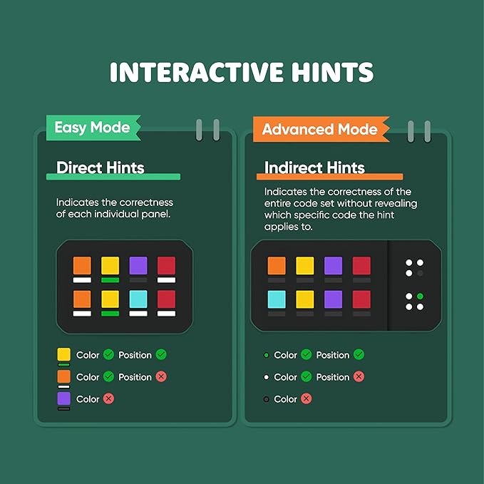 - SOLO AND DUO PLAY MODES: Play alone or switch to Duo Mode to take turns setting secret codes to challenge family or friends. Enhance family bonding time while breaking codes together!