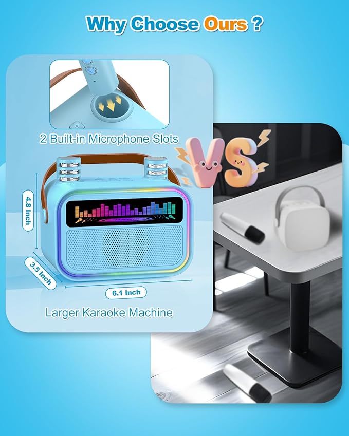 - Built-in Microphone Slots: No more lost mics! This protable karaoke machine comes with 2 handy built-in kid microphone slots,so your child’s mics stay securely stored when not in use,perfect for travel, playdates, or family trips! Say goodbye to missing microphones and tangled wires