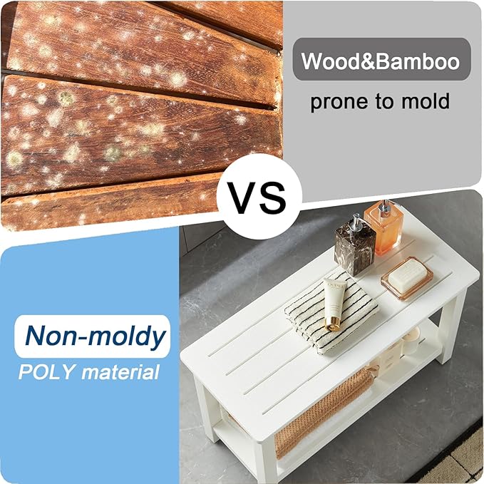 - 【Anti-mil-dew Material】Our shower bench seat is made of HDPS (polystyrene) with 304 stainless screws which never gets rust, this material is not easy to get m-o-l-d, rotting or crack after prolonged exposure to humidity, no splinters and no maintenance, 30 x 13 x 18 Inches enough large to sit (THE MOST IMPORTANT IS NO MAINTENANCE)
