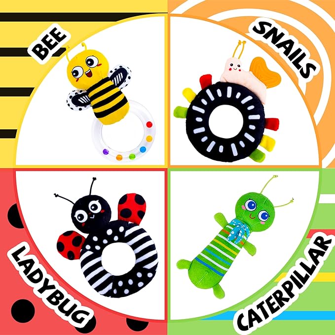 - 【Multi-Sensory & Cognition Development】The sounds that capture attention and aid in auditory development. The toy helps develop tactile sensitivity and visual processing. The vibrant colors of the caterpillar and bee, along with the high-contrast black and white patterns of the snail and ladybug, are specially chosen to aid in your baby's visual acuity. It is a perfect learning and educational toy for babies to develop cognition.