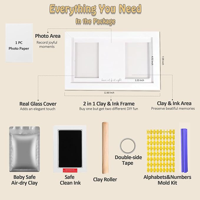 - 2-in-1 Ink & Clay Baby Footprint Kit: This unique baby handprint and footprint kit combines both ink pad and clay mold, offering two creative ways to preserve your baby’s tiny hands and feet. Whether you prefer the classic inkless prints or the 3D clay impressions, this kit provides double the options for creating unforgettable keepsakes. A versatile addition to your baby shower gift list or gift registry by name.