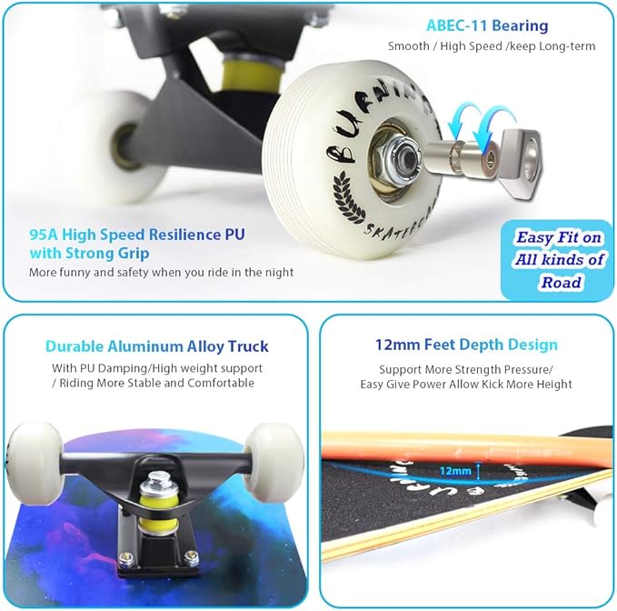 - 【STICK MATERIAL】 7-Ply 31" L x 8" W x 4" H Maple Wood make the wood deck very durable and can bear 220lbs weight , Super soft PU Wheels cut off damping when you riding , Alloy Truck provide more steady structure for skateboard, ABEC-11 Bearings make the wheels turn around more smoothly , Pattern: Heat Transfer(which was printed onto the board,not a sticker.) make the pattern durable a long time.
