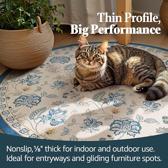 jinchan 8ft Floral Round Rug for Dining Room Washable Living Room Rug Vintage Romance Design Non Slip Indoor Floor Cover Lightweight Low-Profile Throw Carpet for Bedroom Porch Patio, Blue/Beige