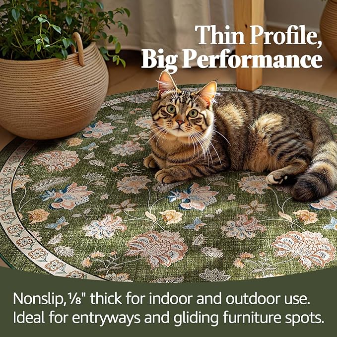 jinchan 7ft Floral Round Rug for Dining Room Washable Living Room Rug Vintage Romance Design Non Slip Indoor Floor Cover Lightweight Low-Profile Throw Carpet for Bedroom Porch Patio, Green