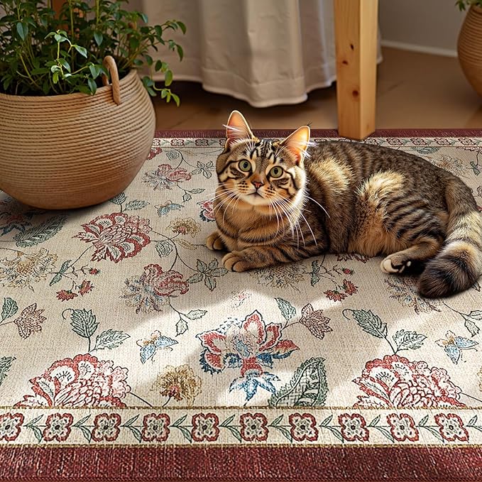 jinchan 8x10 Floral Rug for Living Room Washable Bedroom Rug Vintage Romance Design Non Slip Thin Indoor Floor Cover Large Low-Profile Throw Carpet for Dining Room Office, Red/Beige