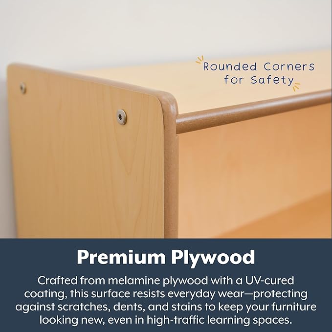 - STURDY MELAMINE CONSTRUCTION: Made from 5/8” thick maple-faced melamine with a UV finish, this montessori bookshelf is resistant to scratches and stains. Rounded corners and a recessed back panel enhance safety, making this a durable addition to any daycare furniture or classroom furniture setup.