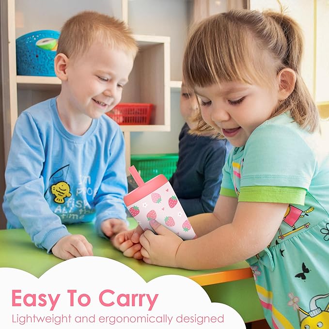 Kid Insulated Stainless Steel Tumbler with Silicone Straw, 12oz Sippy Cup for Kids (Strawberry)