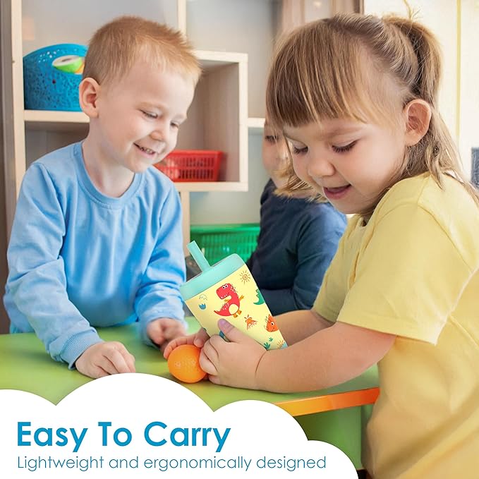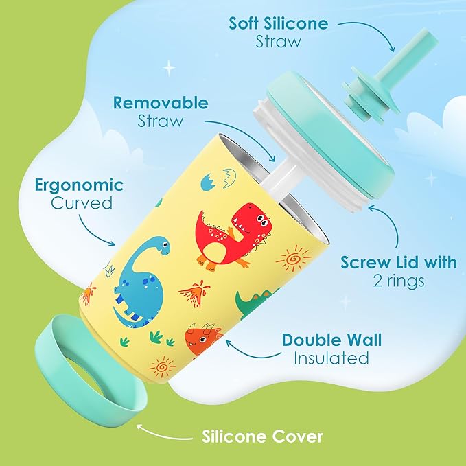 Kid Insulated Stainless Steel Tumbler with Silicone Straw, 12oz Sippy Cup for Kids (Playful Dinosaurs)