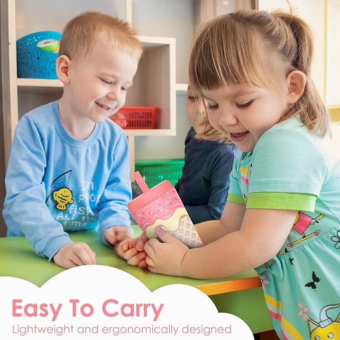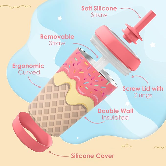 Kid Insulated Stainless Steel Tumbler with Silicone Straw, 12oz Sippy Cup for Kids (Sweet Ice Cream)