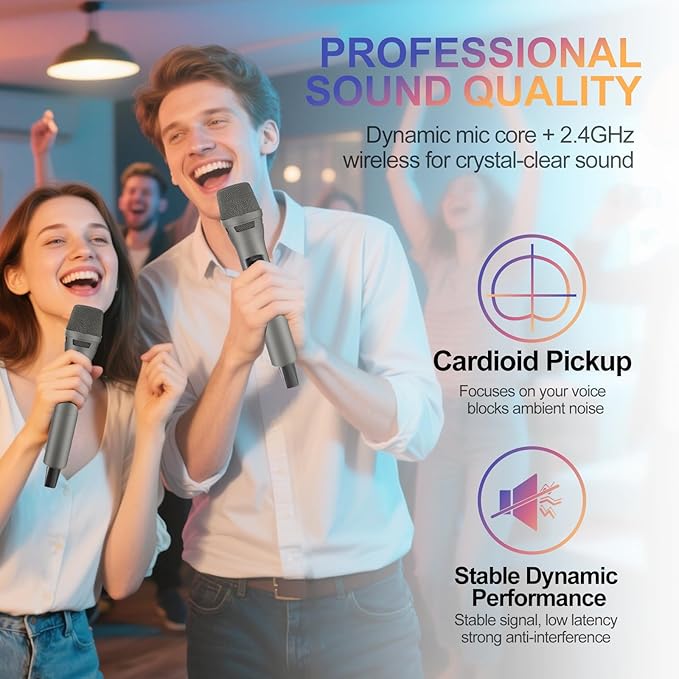 - 📡 ROCK-SOLID WIRELESS CONNECTION - Say goodbye to dropouts and interference! Our advanced 2.4GHz transmission ensures an incredibly stable and ultra-low latency connection. Enjoy seamless singing and speaking up to 100 feet away, giving you the freedom to move around the room, interact with the audience, and own the party without being tethered by cables.
