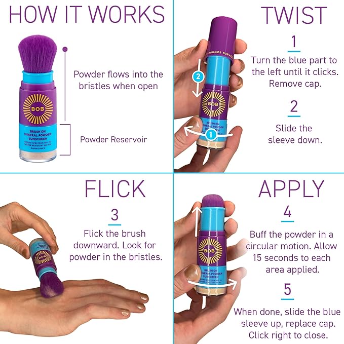 - No Fuss Application: BOB KIDS fluffy purple brush makes applying sunblock easy for both you & your child. To open, twist the bottom of the brush to the left & twist back to close; No mess, no tears