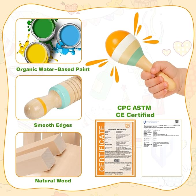 - π± Child-Safe Montessori Toys for Toddlers 1-3- Our baby musical instruments are made from natural wood & non-toxic water-based paints. The montessori instruments for toddlers are CPC/ASTM certified. The montessori baby toys come with Smooth edges, no splinters, and baby-safe construction ensure worry-free play. Ideal toddler musical instruments for 1 2 3 Year Old, BPA-free and easy to clean.