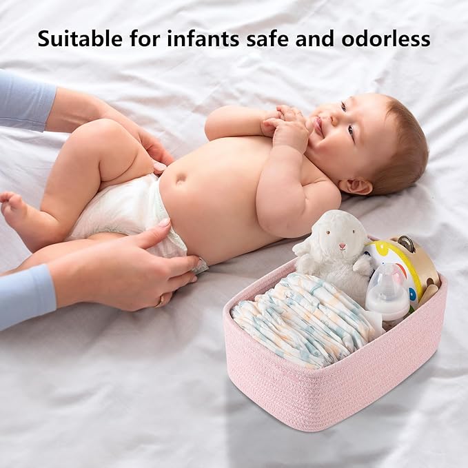 - [Premium Cotton Material]:Our cute baby storage baskets are made of high quality cotton hand-woven by workers, soft and odorless, no sharp edges and corners, very friendly to babies and pets, a good choice for baby-sitting baskets and dog or cat toy baskets