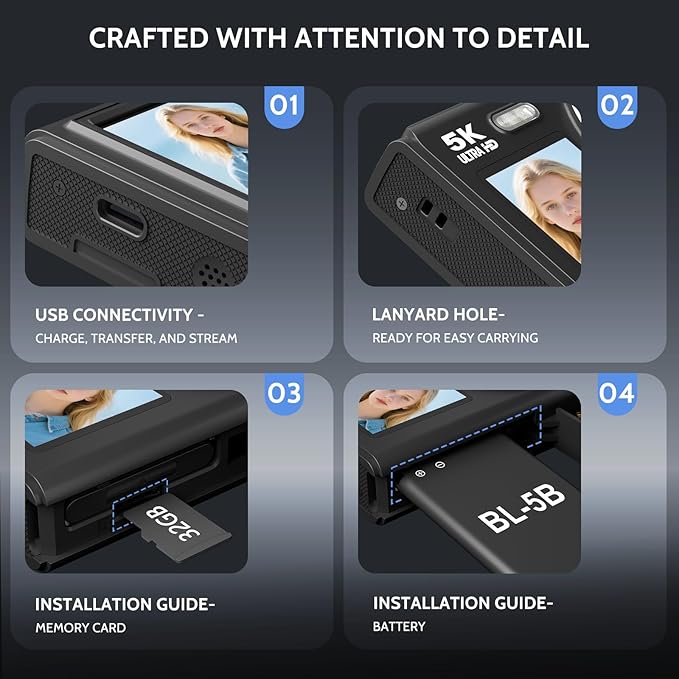 - 【Upgraded 5K 80MP Digital Camera】This 5K camera has been upgraded in terms of parameters, performance and appearance design, and the body is lighter and more portable. The DISP button on the front and back screens can switch screens with one click, which is extremely convenient to operate without any technical knowledge. Whether it is daily shooting, study life or weekend adventure, it is an ideal choice for beginners.