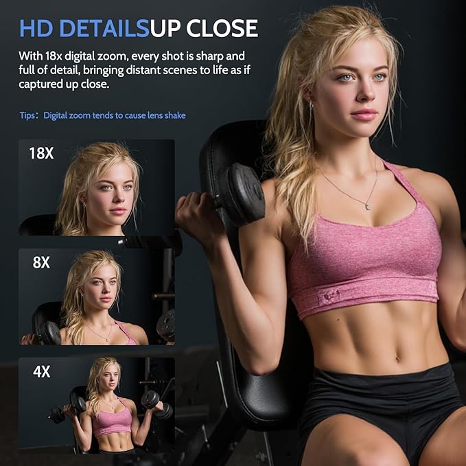 - 【Powerful Zoom & Precision Focus for Every Shot】This digital camera is equipped with 18X digital zoom and three focus modes—auto, manual, and fixed—this camera gives beginners more control over their images, whether capturing landscapes or close-up details.