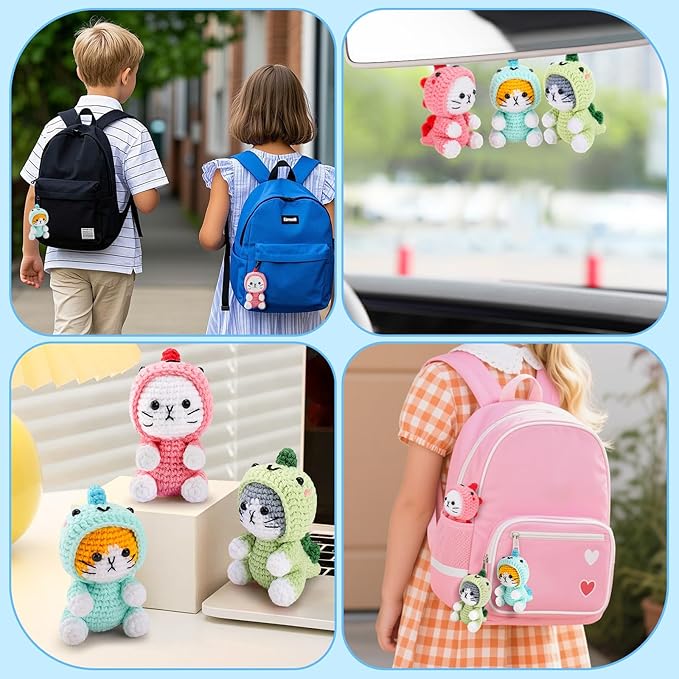 - 【All-In-One Crochet Starter Kit】Beginner crochet kit comes with everything you need to create cute amigurumi crochet kit: enough yarn, crochet hook*2, safety eye*12, back pieces*6, knitting markers*5, needles*1, stuffing*1, scissor*1, hot melt glue stick*1. In addition to the materials, the crochet kit for beginners kids includes beginner-friendly video tutorials, dinosaur cat crochet pattern and basic crochet manual.