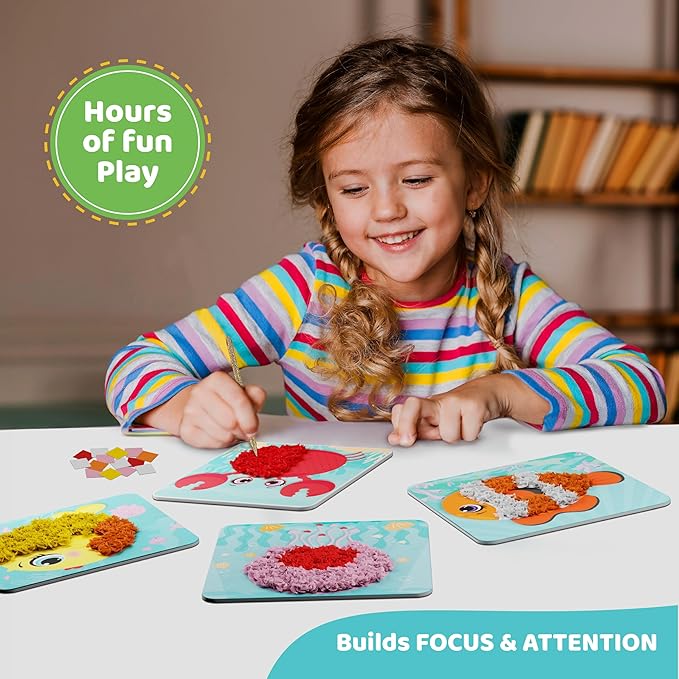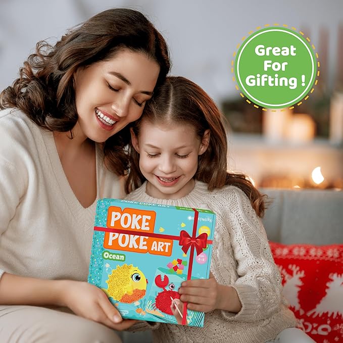 - POKE POKE ART KIT: Engage your child's creativity with this poke poke art activity! Kids can poke in and decorate ocean animals like crab, turtle, clownfish, seahorse, jellyfish, and pufferfish using fabric squares and foam shapes without any mess—no glue, cutting, painting, or colouring required.