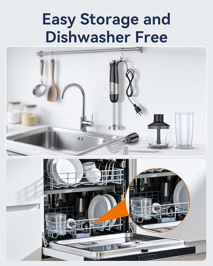 - Easy to Clean: The snap-on/off detachable attachment design makes this emulsifier blender easy to connect and disconnect and a breeze to clean as they all comes off easily than a regular blender. You can just rinse it off after use or wash it in dishwasher. It can hang with the hook and the main body can easily be cleaned by wiping with a soft damp cloth. (except blender shaft and chopping bowl lid requires hand wash and the water temperature of the dishwasher should be below 75°).