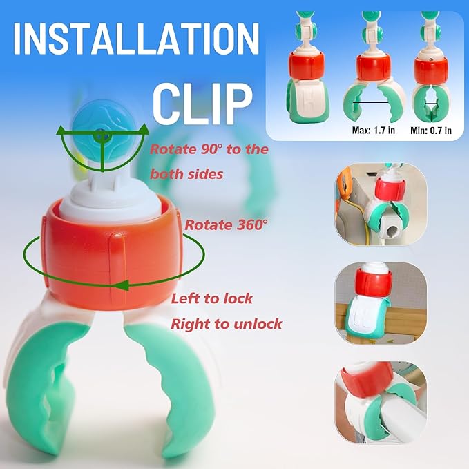 - 【Suitable for Most Baby Seats】- You can attach this colorful toys arch to strollers, bassinets, crib, car seat, pram and high chair. Tightening the clips to hold well on the stroller bar and adjusting the height and angle to reach the suitable size for baby to grab and play with. Good for exercising baby's grasp ability and hand-eye coordination