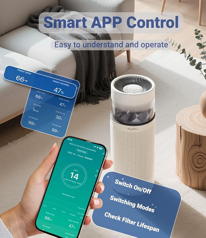 - Air Purifier and Humidifier Combo: Modern design air purifier for large room, effortlessly tackle the air issues in your environment. Ideal for bedroom,living room,kitchen,office,appartment and so on. Clean large spaces up to 1546 sq.ft in 60 mins or 773 sq.ft in 30 mins. (CADR: AT LEAST 330 m³/h)