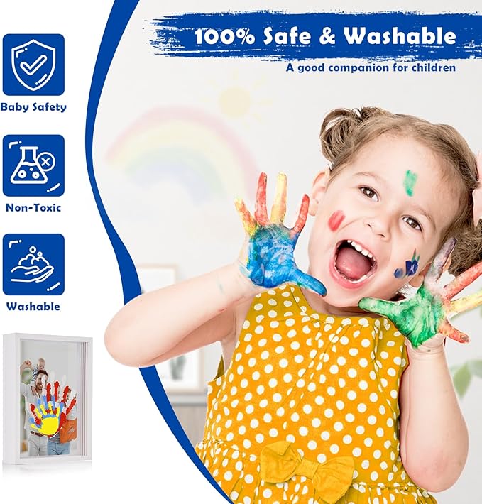 - Complete Family Handprint Kit with Picture Frame – This all-in-one set includes everything you need: premium-quality paints, brush, 4 transparent handprint sheets, and a stylish photo frame. Create lasting memories with your family and display them with pride!