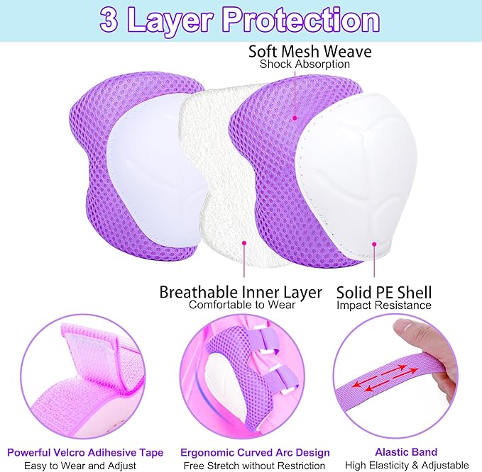 - 【Kids Knee Pads and Elbow Pads Set】 The kids bicycle helmet comes with 2 x Elbow Pads, 2 x Knee Pads, and 2 x Wrist Pads. Consist of an anti-scratch extra hard PVC shell for protection, and velcro adjustable straps ensure the protective gear will not shift. Protective gear pad set provides comprehensive safety protection for children.
