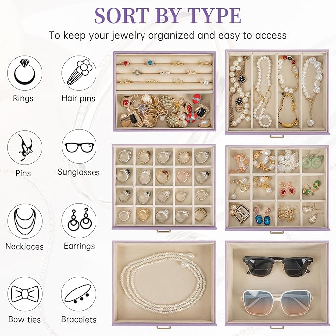 - 【LARGE CAPACITY】With 6 versatile pull out drawers, this huge jewelry box can store a lot of jewelry accessories, such as rings, earrings, necklaces, chains, bracelets, and so on. One deeper drawer is designed for large jewelries