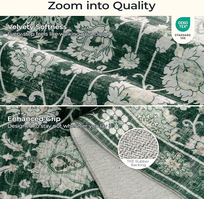 Floral Washable Area Rugs 5x7, Vintage Rug for Living Room, Large Bedroom Carpet, Non Slip Low Pile Ultra Soft Carpets for Indoor Dining Home Nursery Playroom Under Table, Dark Green