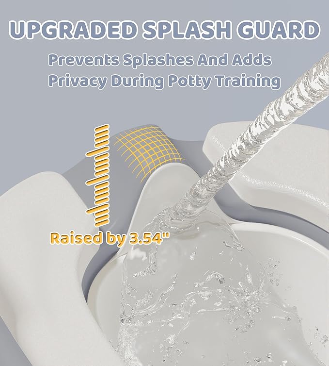 - 【Splash Guard & Urinal Design for Boys】Includes an extended splash guard with a 2.8-inch deep arc recess to prevent spills, ideal for boys during potty training. The urinal-style front makes it easier to keep things tidy and mess-free, promoting better hygiene and easier cleanup.