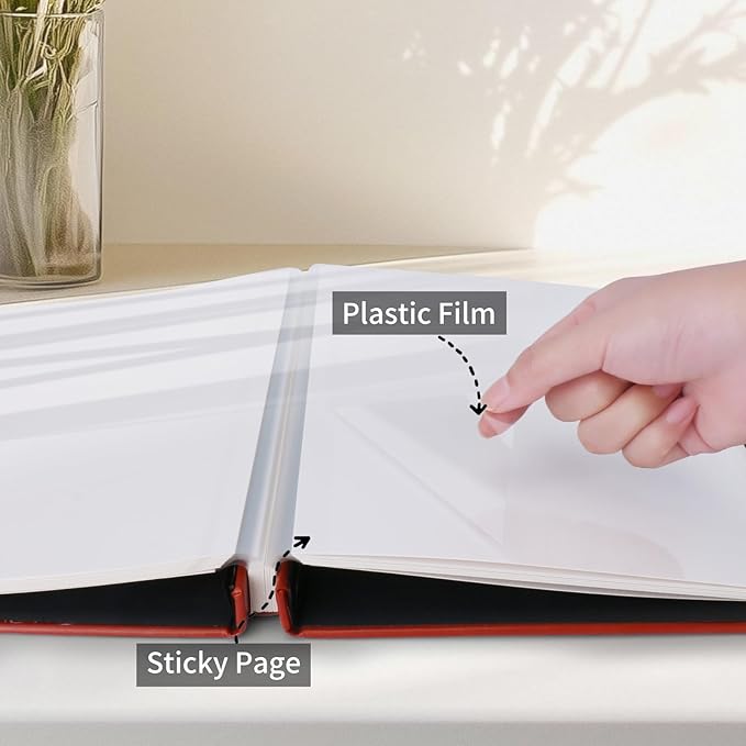 - 【PERFECT SELF-ADHESIVE DESIGN】: Transparent plastic overlays are self-adhesive to the page and hold photos tightly and clearly.No extra glue needed, more convenient and eco-friendly.