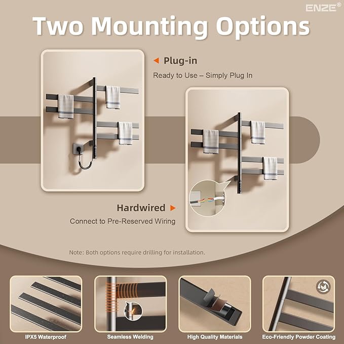 • 【Flexible Installation: Hardwired or Plug-In】 Designed as a hardwired towel warmer or plug-in unit, install this wall-mounted heated towel rack with included hardware and instructions. Great as a towel heater rack or electric towel drying rack for any bathroom setup.