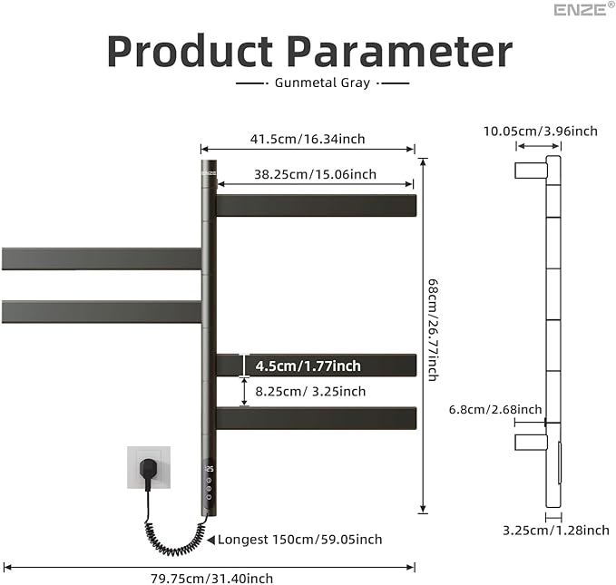 • 【LED Touch Panel with Adjustable Timer & Temperature】 Set the perfect warmth using the heating towel rack’s LED touch screen. Adjustable timer (1–24 hours) and temperature control (115–150℉) keep towels cozy. Use the constant 115℉ mode for all-day warmth on your heated towel bars for bathrooms.