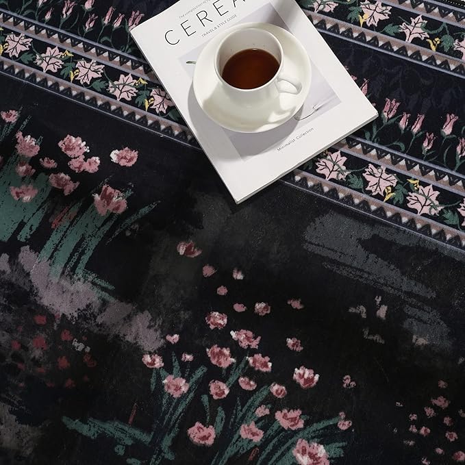 4x6 Rug for Bedroom Impressionist-Style Vintage Washable Rugs Non Slip Low Pile Small Carpet for Bedside Kids Room Office Dining Room, Black