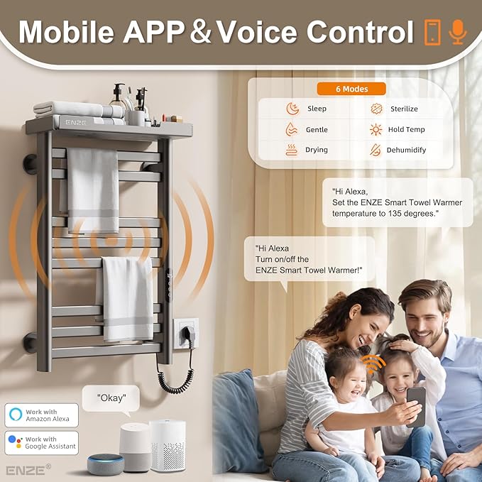- 【Smart WiFi Towel Warmer with Voice Control】 Control your electric towel warmer anytime via the WiFi towel warmer function through Tuya app, Alexa, or Google Assistant. Experience hands-free convenience with this smart towel warmer designed for modern living.