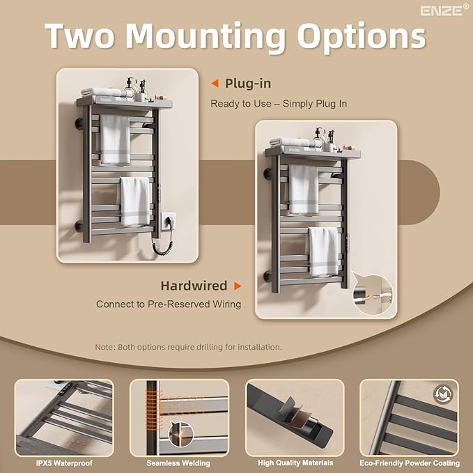 - 【Flexible Installation: Plug-in/Hardwired】 Whether you're retrofitting or renovating, this unit supports both plug-in towel warmer bars and hardwired towel warmer installations. Made of eco-coated low carbon steel, it’s a durable heated towel rack for bathroom, ideal as a wall-mounted heated towel rack or towel bar warmer for bathroom.