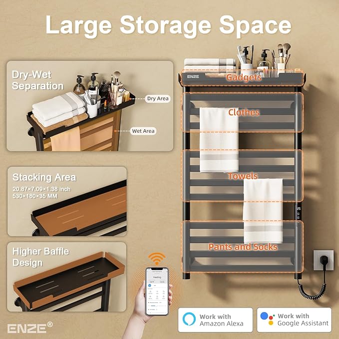 ENZE Heated Towel Rack with Shelf and Wi-Fi App Control, 11 Bars Electric Wall Mounted Towel Warmer with Timer & Adjustable Temperature, Low Carbon Steel, Plug-in/Hardwired, Matte Black
