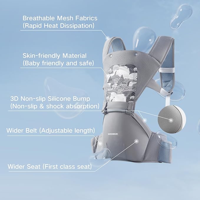 - 【6-in-1 Versatile Baby Carrier】SEEDNUR baby carrier offers 6 carrying positions—hip seat (sitting/lying) and carrier (front-in, front-out, back)—suitable from newborn to toddler. Adjustable straps and waist belt fit parents and babies of different body types.