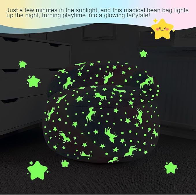 - Unicorn Bean Bag Chair: This toddler bean bag chair with glowing unicorn pattern. Expose the fluffy bean bag chair to sunlight or light during the day, the small bean bag with a soft glow adds a touch of wonder to any kids' room at night
