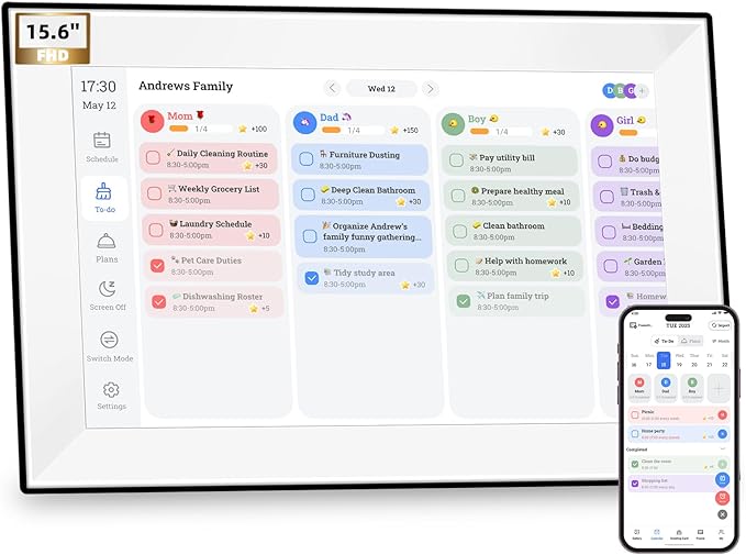 - The Hub Where Love Organizes: Mount it in the kitchen or stand it on your desk – this 15.6" touchscreen becomes your family’s command center. Features alarm setting, to-do lists, and a clear monthly/weekly schedule view – perfect for busy families.With 14 languages, sleep mode & wall-mount, it adapts to your home’s rhythm.