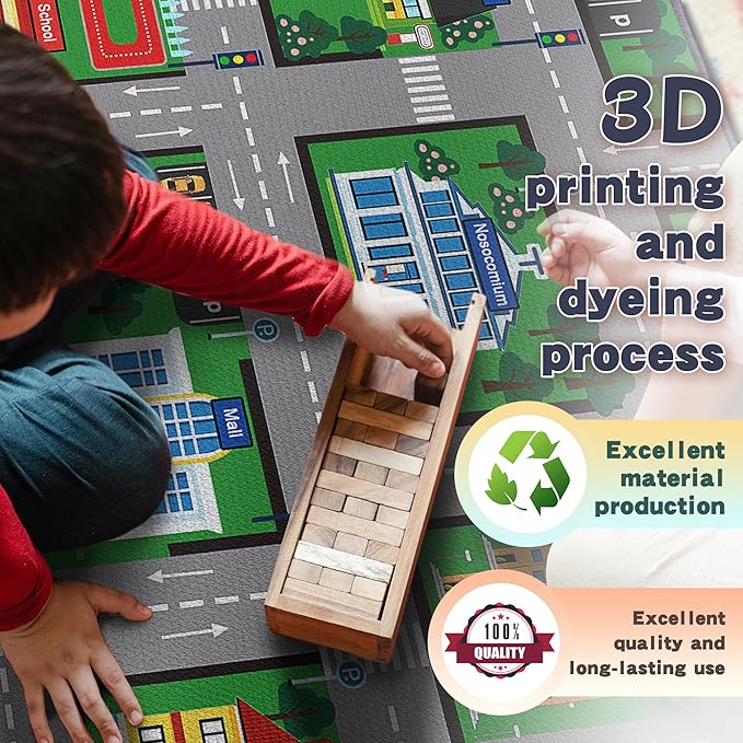 - Detailed & Recognizable Scenes:Our carpet includes facilities such as a bakery, bookstore, department store, pharmacy, supermarket, hair salon, and school, allowing children to enjoy having a city of their own that they can control.